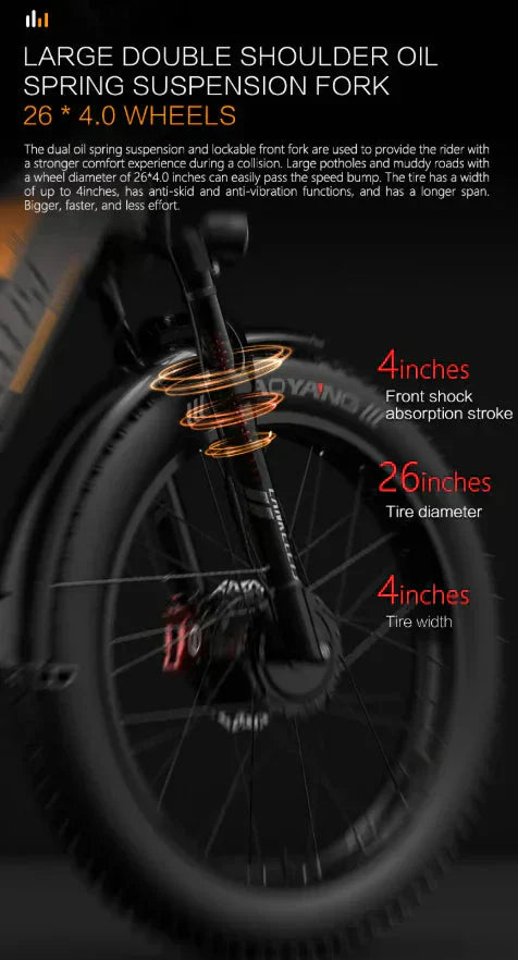26×4.0″ fat tires for stability on sand, snow, gravel, and pavement.
